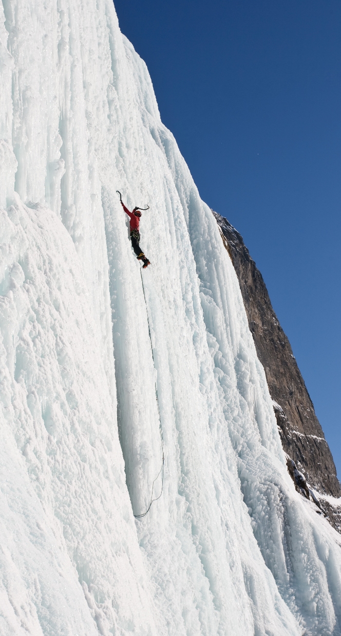 The next day Crista-Lee and I went out to Lake Louise and climbed Louise Falls and this weekend we climbed the amazing Weeping Wall at Icefields Parkway where we met Rafal and Jeff, who snapped this photo of me leading out of the ice cave in the middle of the wall: